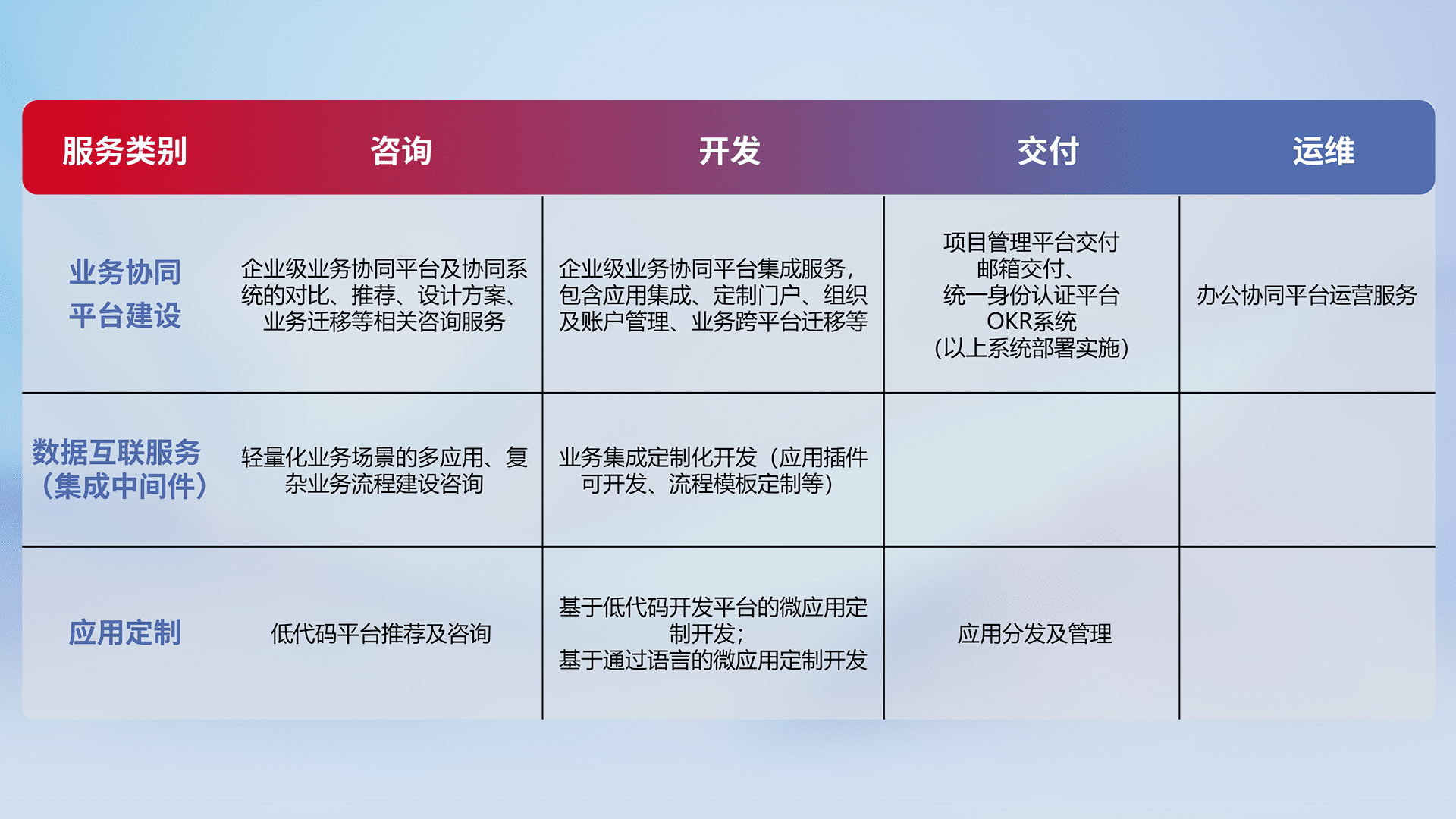 针对钉钉、、企微、、、IDaas等平台级产品提供产品的规划、、、、方案、、、交付、、、、定制化开发等服务,,,实现如统一协同办公、、、、智能客户服务、、混合会议管理、、智能数据查询、、等业务场景,,实现数字化转型。。。。